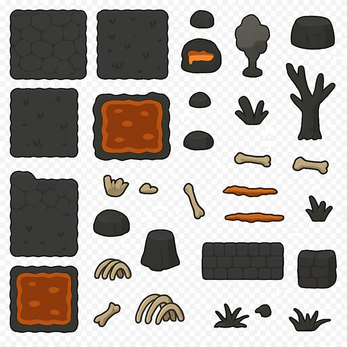 - Includes: floor tiles, lava tiles, walls, rocks, trees, bushes, bones, ribs, small details